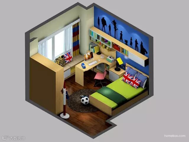 ☑业主的宝贝是个男孩,所以房间采用活泼的蓝色,酷炫的英雄动漫形象则更显男子气概。