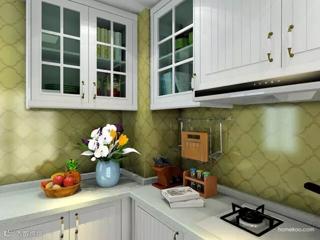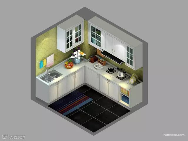 ☑厨房采用典型“L型”的橱柜摆设,巧妙地利用了空间的拐角。象牙白的柜面符合整个家的风格。