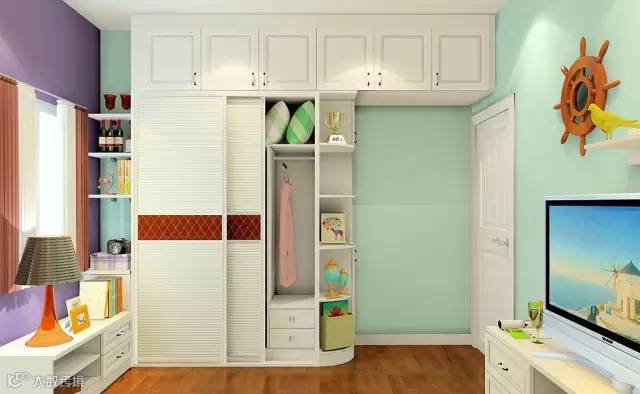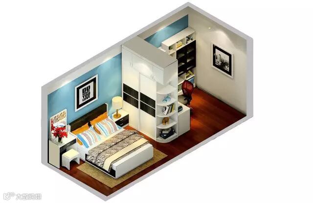 适合户型比较方正的卧室。衣柜设置在门口一侧,传统直角衣柜容易给人一种压迫感,而圆角衣柜能很好的过渡这种感觉。同时弧形储物阁在门口,进卧室就能放东西,相当于卧室的玄关柜。