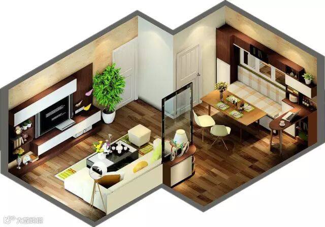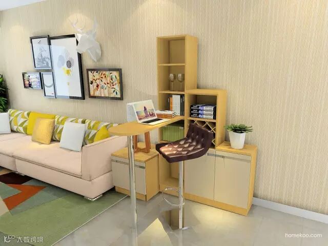 沙发位置连接吧台,将客厅与餐厅隔断开,小巧玲珑的吧台给空间带来一些温馨感。