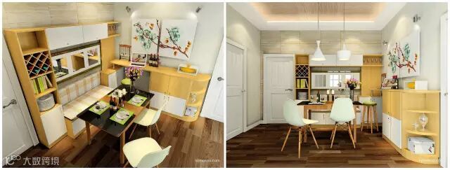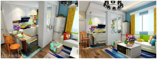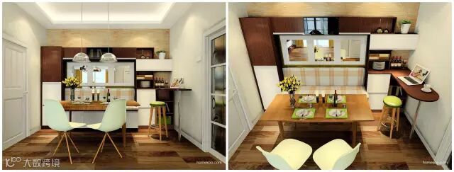 根据户型的特点,做了一款开放式厨房设计,转角的折叠式餐桌+吧台,舒服自然,整体清新自然多功能。最适合喜欢理性思考,感性生活的时尚达人。