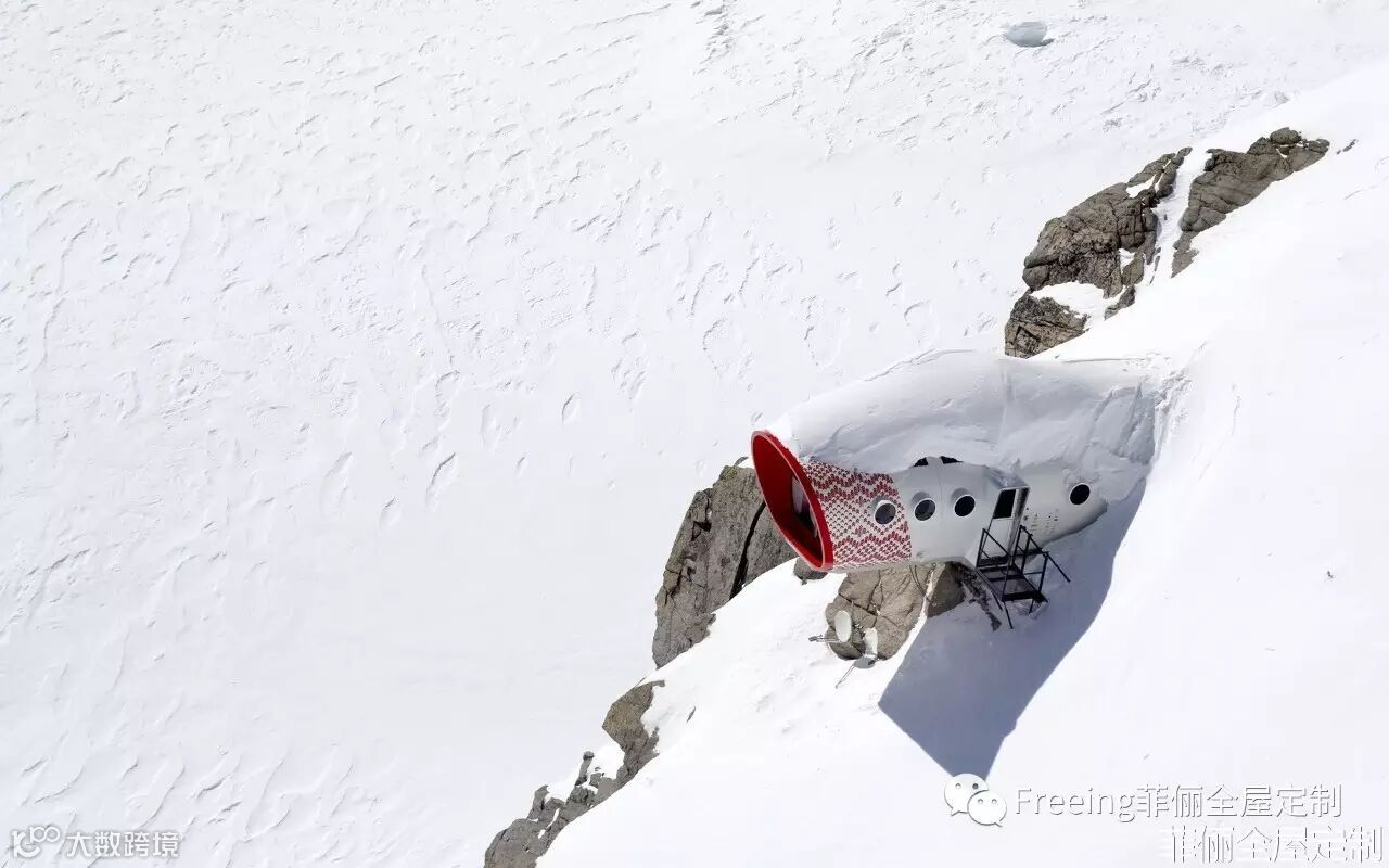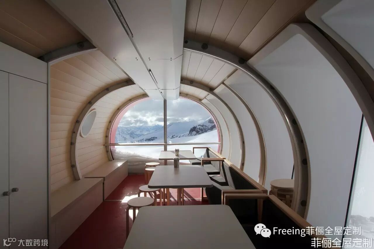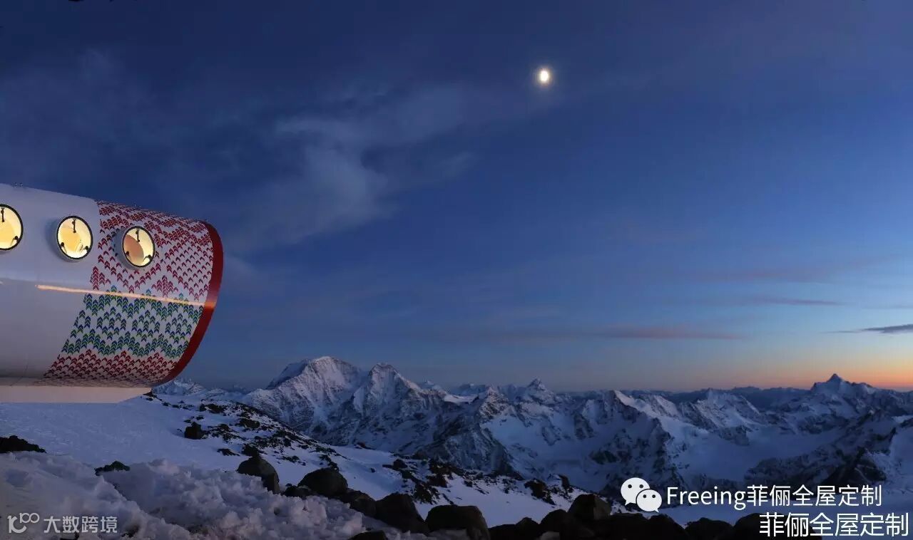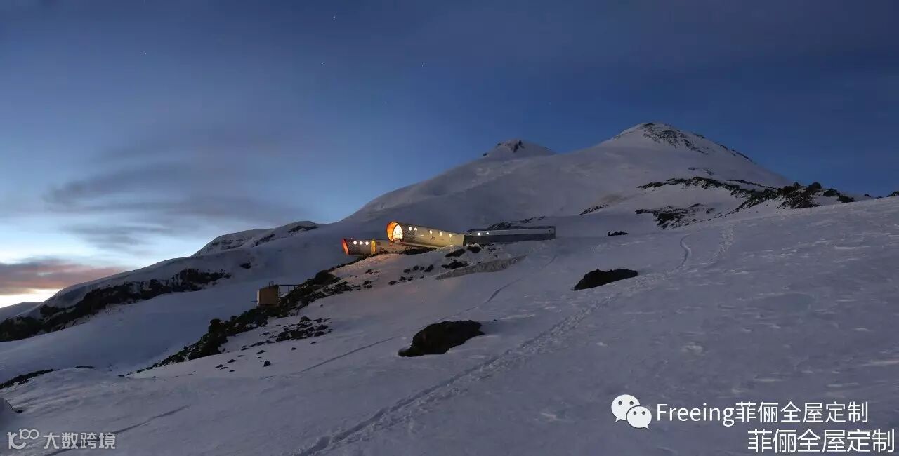 酒店坐落在欧洲最高峰——厄尔布鲁士山海拔4000米处,是一家生态环保酒店,高效利用了可用能源——循环系统用融化的雪水来作清洗用水。