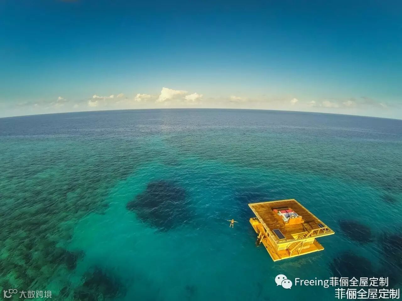 这个浮动结构利用两根系在海底的锚索固定,共有三个楼层,分水上和水下两个部分。水上部分覆盖着当地硬木,可以在这里洗浴,享受阳光,晚上就在这片无人之境享受星光,进入梦境。