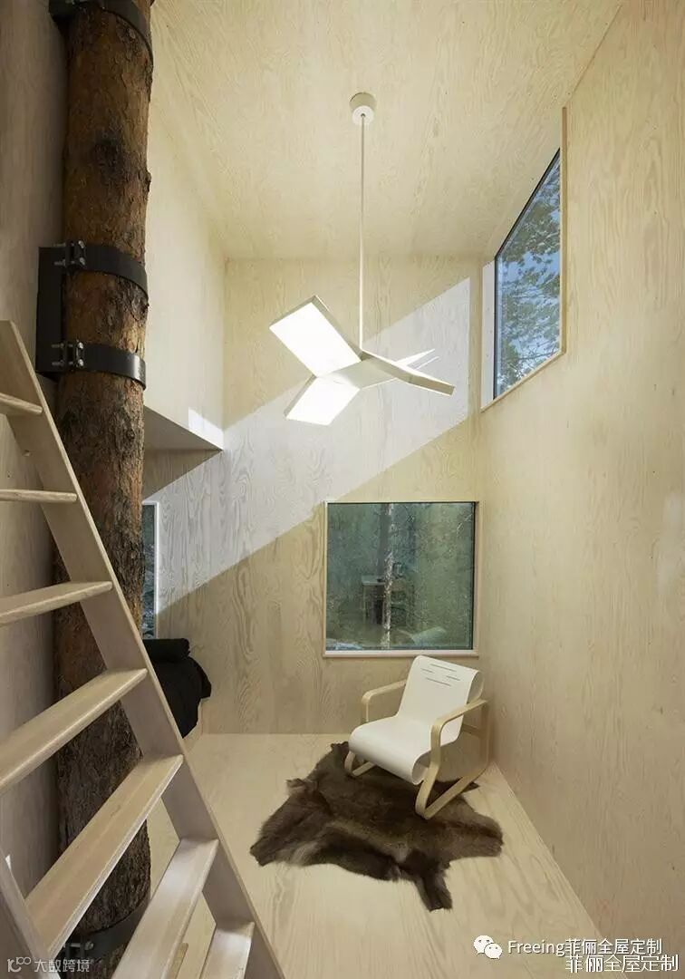 很意外,这间接近北极圈、位于瑞典北部小村庄哈拉斯附近的树屋宾馆,它不是一个童话意象的现实呈现,却是一个具有隐蔽性的避难所。它的存在展示了人们在恶劣的气候条件下开发偏远地区时使用高科技材料和产品(Gore-tex、Kevlar、复合材料、轻质帐篷等)的方式。
