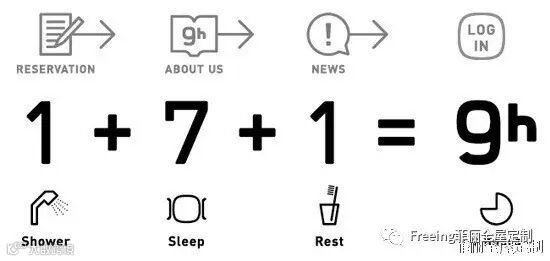 9H即9小时,9个小时包含1小时洗漱+1小时休息+7小时睡眠,据说这就是商务人士在外过一夜的平均时间。旅馆将9小时住宿需求人群定位在出差人士或因加班、醉酒等原因不能归家的人。设计师提出「transitstay(逗留)」概念,只提供最直截了当的住宿功能。
