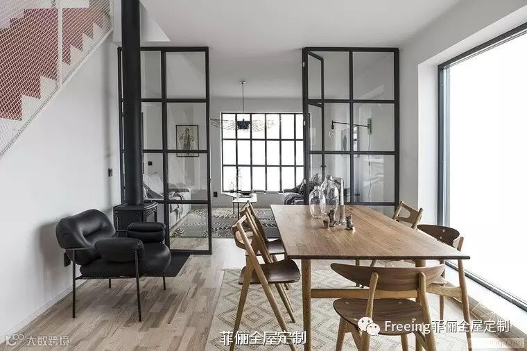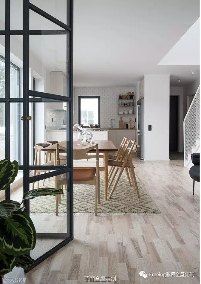 这套双层公寓在瑞典,设计团队希望为北欧风的空间加入硬朗的金属元素,夸张风情的黑色吊灯下,是灰色柔软的布艺沙发;黑框金属玻璃门边,搭配线条圆润的餐桌椅;金属的尖锐和理性被柔软平和的北欧风轻轻化解,又为北欧风的软糯带去精巧和精致的视觉冲击。纯净的白色调和良好的采光,都让这个住宅空间显得干净、柔和、精致有魅力。