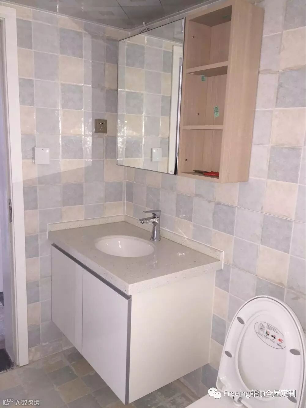 浴室柜的台面采用的石英石的,这种台面耐磨不怕刮划,耐热好,做各种厨卫台面,经久耐用。是一种由90%以上的石英晶体加上树脂及其他微量元素人工合成的一种新型石材。