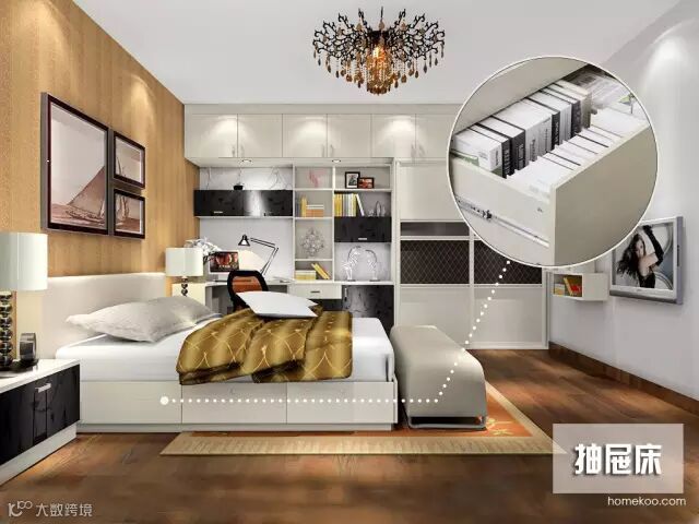 在卧室中使用抽屉床强大的储物功能是收纳细小物件的好方法,利用好看的盒子将杂物有序的整理起来,可以免去床头柜占用的空间,为室内腾出更多的位置。