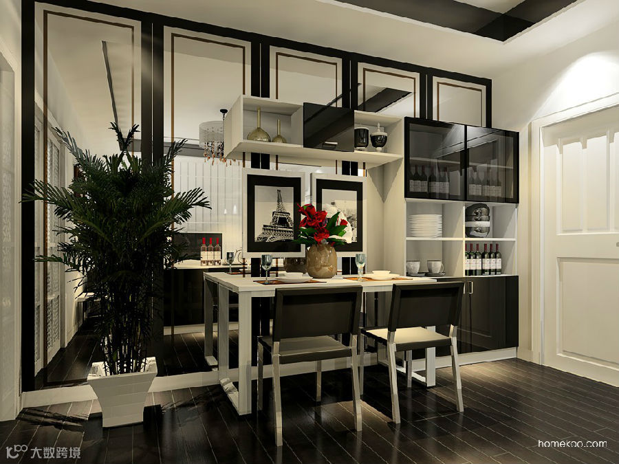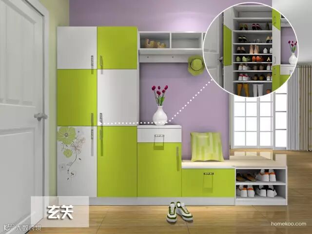 进门处的玄关处设计一个高隔断柜,作为接待客人、换衣、换鞋的地方,也可设置放包及钥匙等小物品的平台。