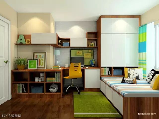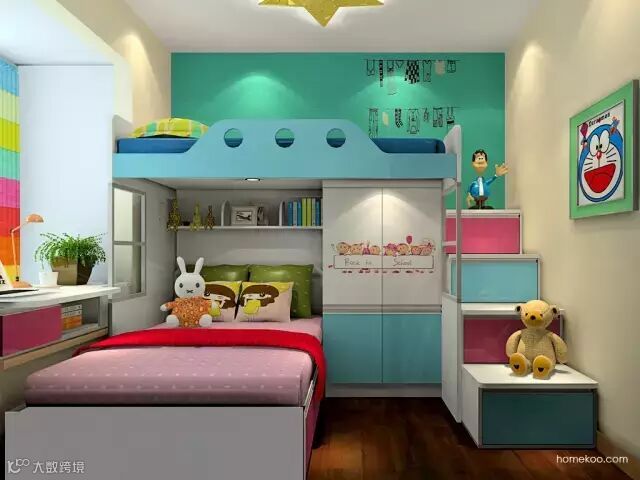 家有两个孩子,上下床最省空间,两个孩子睡在一块,童年也是充满了欢乐不是吗?不过要注意上床的挡板要做高点,防止跌落,保证安全。