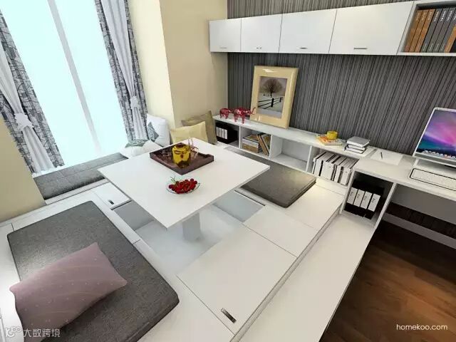 自带升降桌,客人来了有了一个聊天、喝茶的好地儿;晚上降下桌子,又摇身一变成了睡觉的床。是客厅,也是卧房。