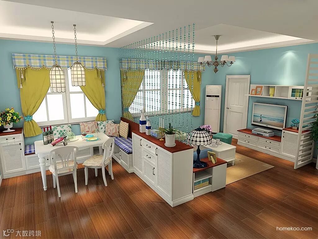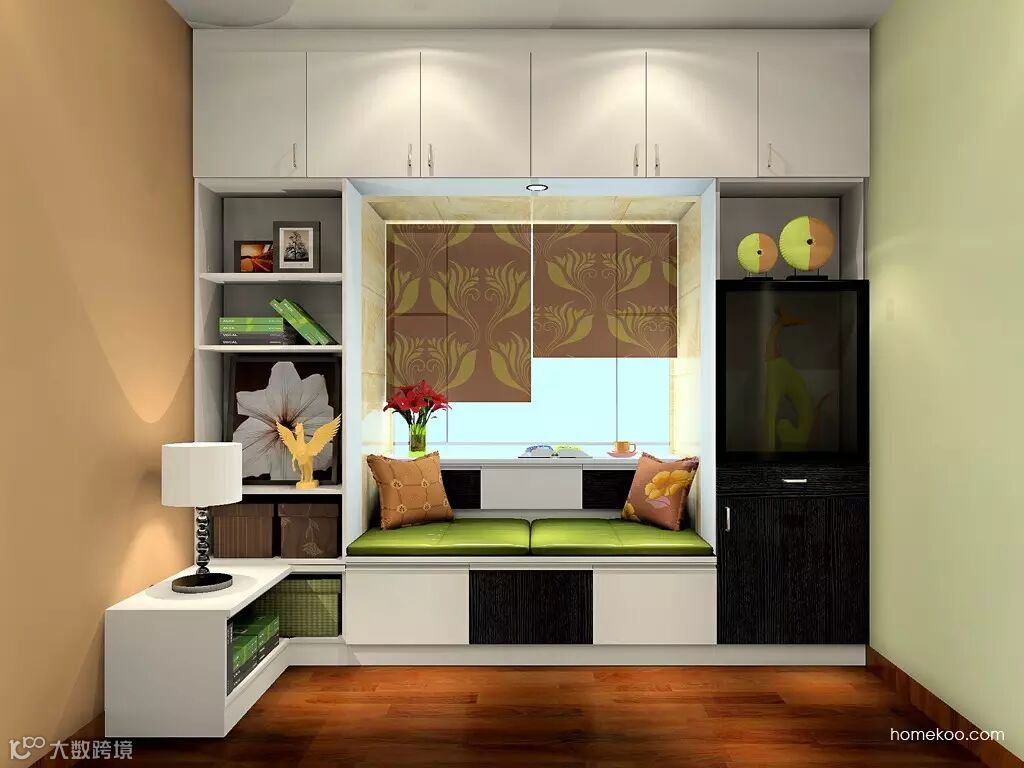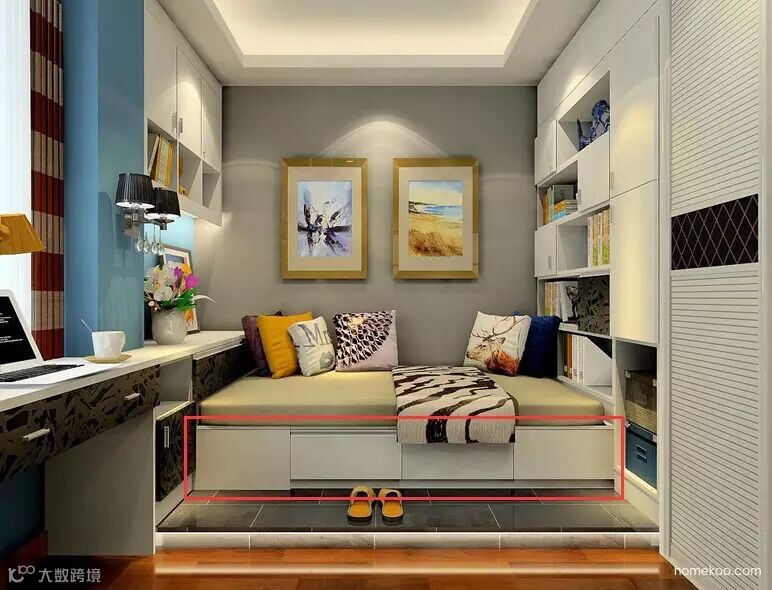 四周打造一圈柜子,收纳、装饰、休闲。