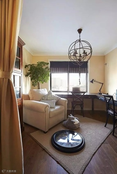 书房,美式的布艺沙发,还打了铆钉,很大气。