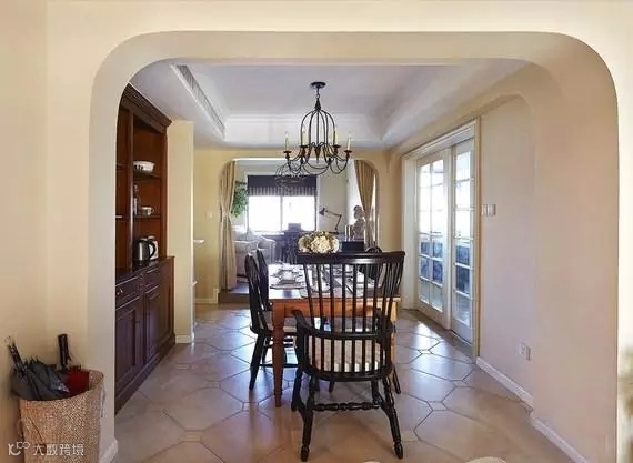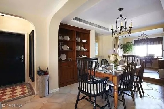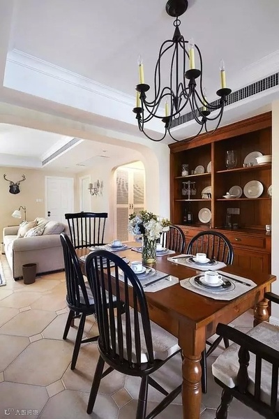 复古色的餐桌椅,加上铁艺的吊灯,非常有生活韵味。