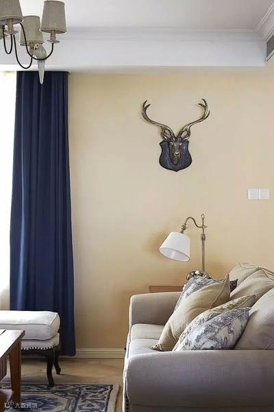墙上面挂着一个鹿头造型的摆件,非常的大气。