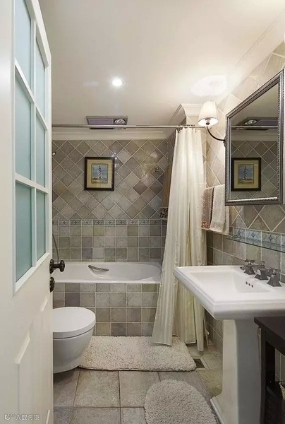 主卫,浴室镜这边的一个特写,地上都是铺子浴室垫。