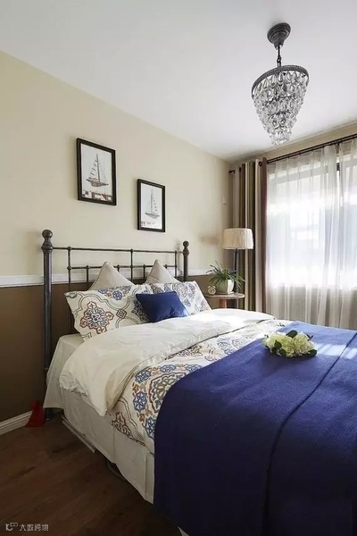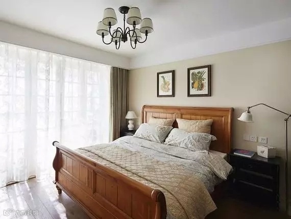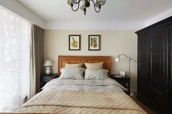 来一张正面照,窗帘和床品选的同一个色系,减弱美式的那种气氛。