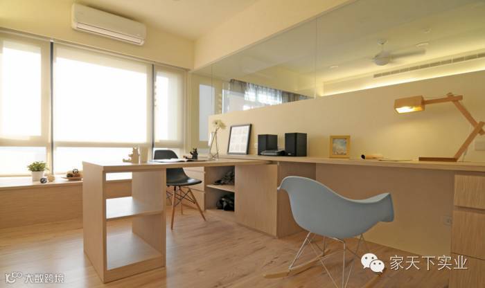 书房上方处以轻透玻璃与作为划分的功能空间,同时加大空间的尺度;工作桌面更可以形随功能的调整移动。