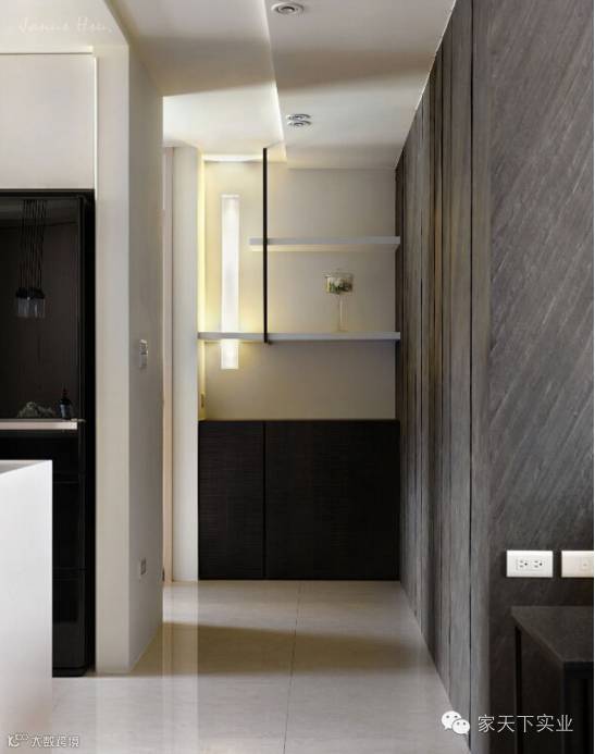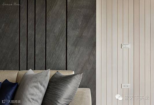 以板岩铺贴而成,直条纹的沟缝拉出层次感,并拼接浅色木纹隐藏通往主卧的暗门。