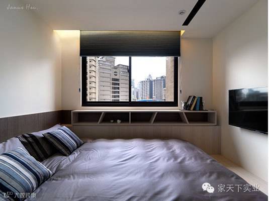简约床头板设计更显精致,儿子房为化解横樑经过,设置收纳柜体垫高墙面,客房空间则是饰以木皮材质。