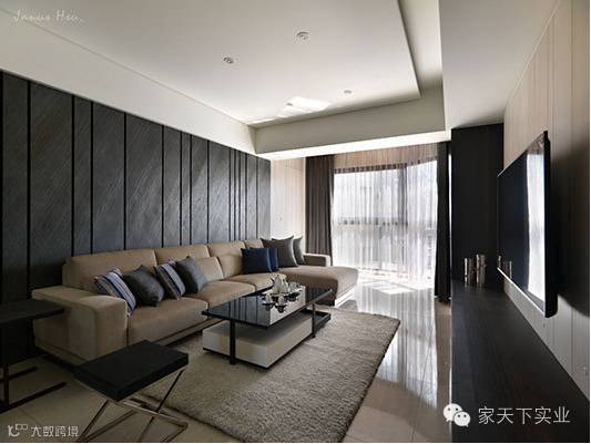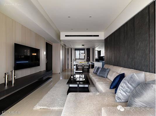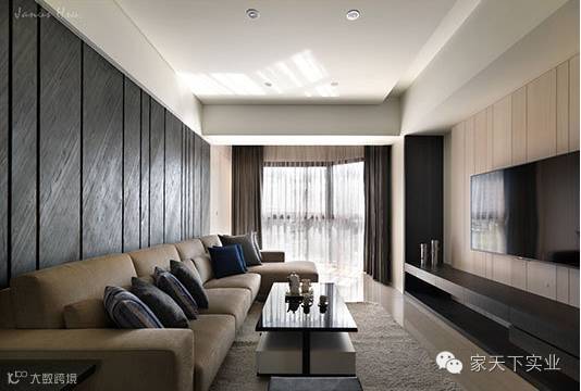 在没有过多华丽的语汇下,材质的使用更显重要,设计师大量使用木纹材质,直线木纹的电视墙一路延伸至餐厅壁面,无止境的线条拉宽空间阔度,相对应的沙发背墙则使用板岩铺贴,在深浅对比中凸显软硬质感,创造出规律的线条层次。