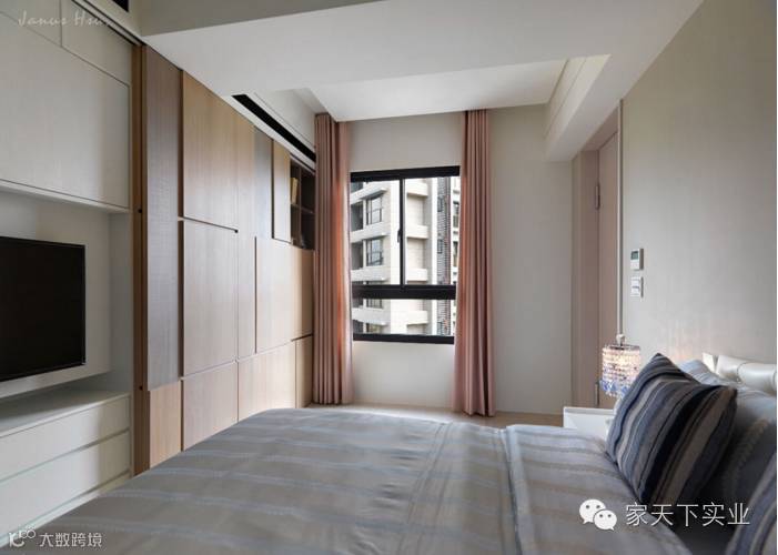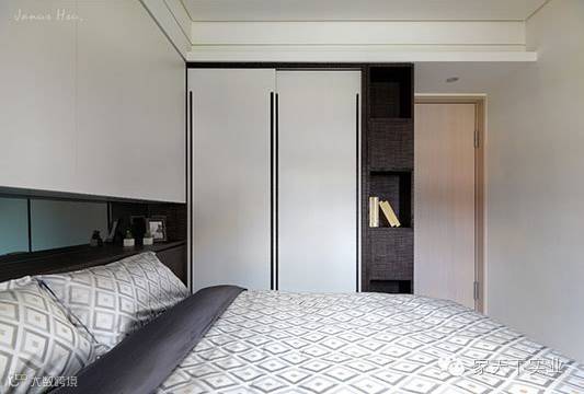 运用深浅不一的木纹呈现出拼贴效果,移动式的推拉门设计,将更衣室隐藏于门片后方。