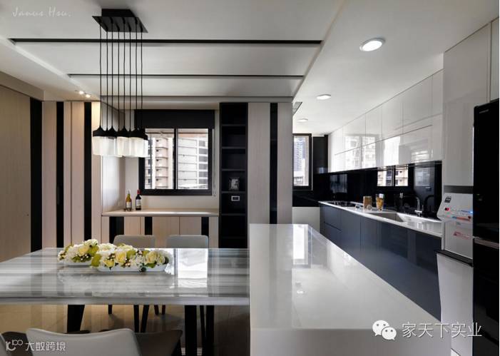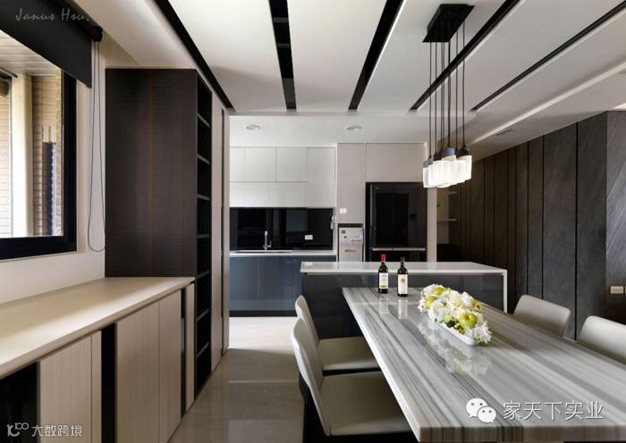 透过中岛和餐桌的设置,将餐厅和厨房连接,开放式的设计创造出自由而流畅的动线。
