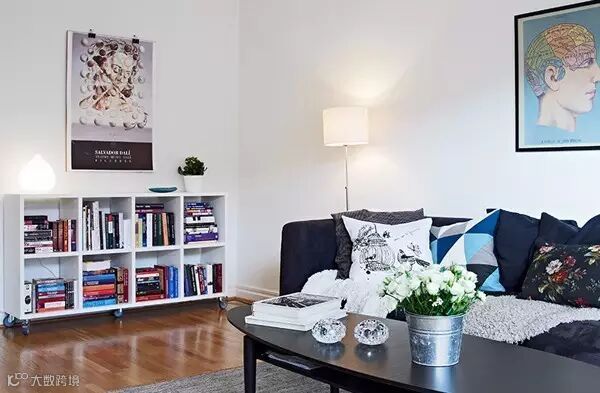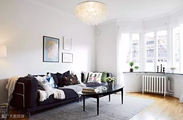 ▲ 客厅格调温馨,白色墙壁搭配原木色地板,完美体现北欧家居风格。大面积的白墙上没有多余的装饰,只挂了三幅简单的装饰画;深色的沙发搭配了带有色彩花纹的抱枕,点亮客厅的空间色彩。