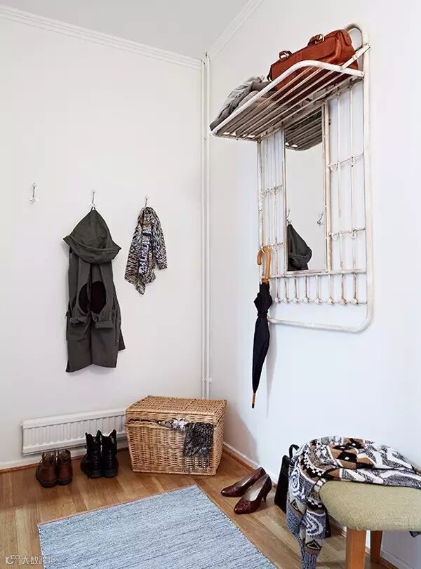 ▲ 玄关采用大面积的白墙,只用简单个性的衣帽架进行装饰,感觉效果也不错~墙角一个竹筐,可以用来放置换下来要洗的衣物,美观实用!