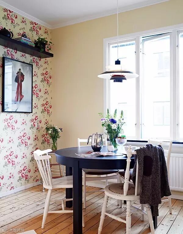 ▲ 用餐区旁,贴了一整面墙的乡村风壁纸,搭配白色餐椅及实木地板,再摆上几盆绿植,妥妥的乡村风感受出来没?