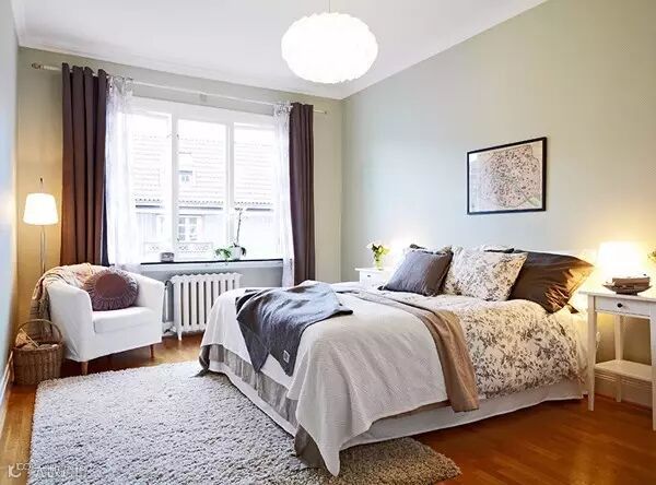 ▲ 卧室没有延续客厅大面积白色的风格,而是用绿色来粉刷墙壁,结合微黄的灯光,让卧室的气氛变得特别温馨。床品和窗帘也选用素色,整体风格朴素自然。