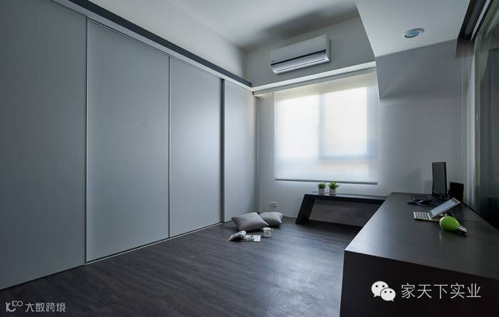 木纹质材铺陈一地,同时也成为书桌样貌,户外光源照映在白色衣柜上,展现简洁明亮之美。