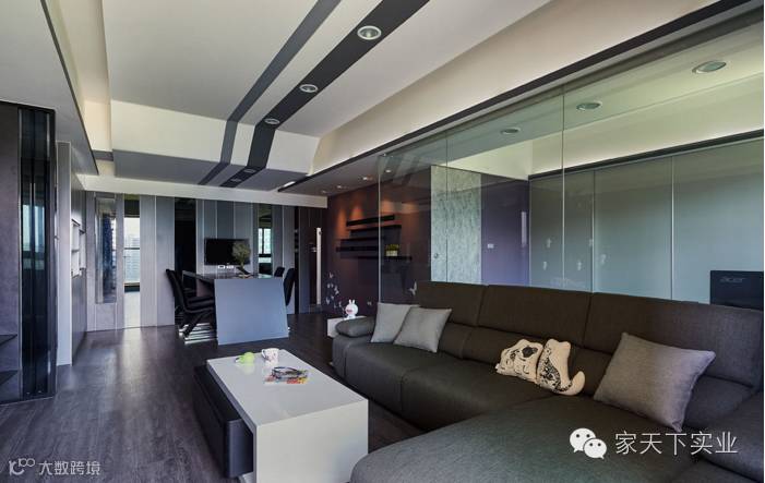 沙发后方以透明隔间墙作为客、书房的领域区隔,透视手法带来放大、延伸的效果。
