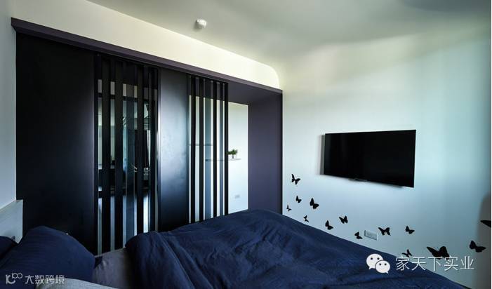 墙面延续客厅里以蝴蝶为意象的时钟,沉稳且简约的寝具与造型门面,营造出静谧的休憩氛围。