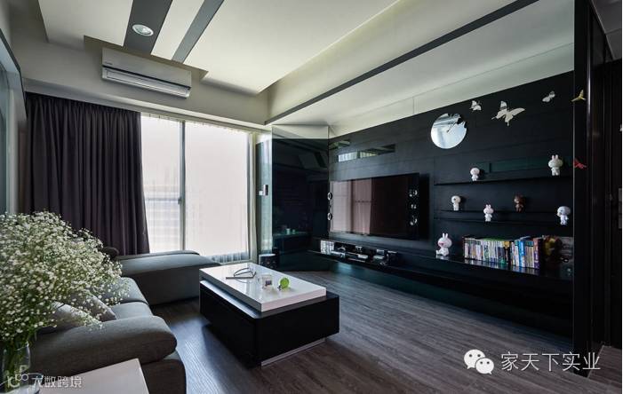 以美耐板铺陈的电视墙体,利用几何切割手法来交错使用黑镜,一旁结合层板的展示手法,打破质材原有的呆板感受。