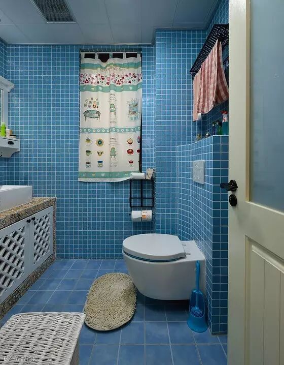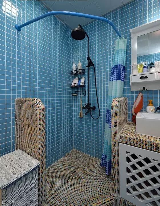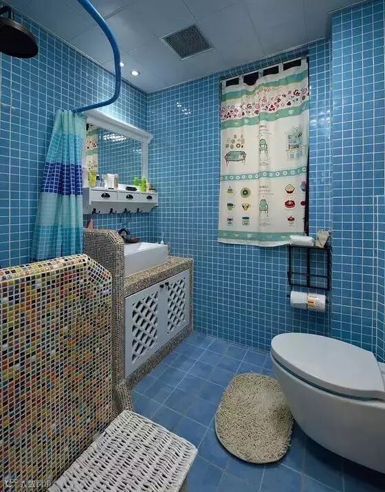 五彩的马赛克打破了通体蓝色的卫生间的冰冷气息,增添了些许趣味