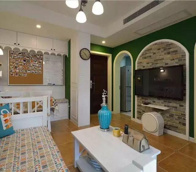 大面积的浅色墙壁,白色沙发和茶几,仿古拼花砖让空间的底色显得整齐而干净。