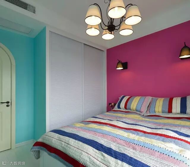 主卧通过墙面漆的颜色跳跃,注重颜色的协调,墙面以红色为底,热情洋溢,仅以壁灯装饰,没有多余的造型