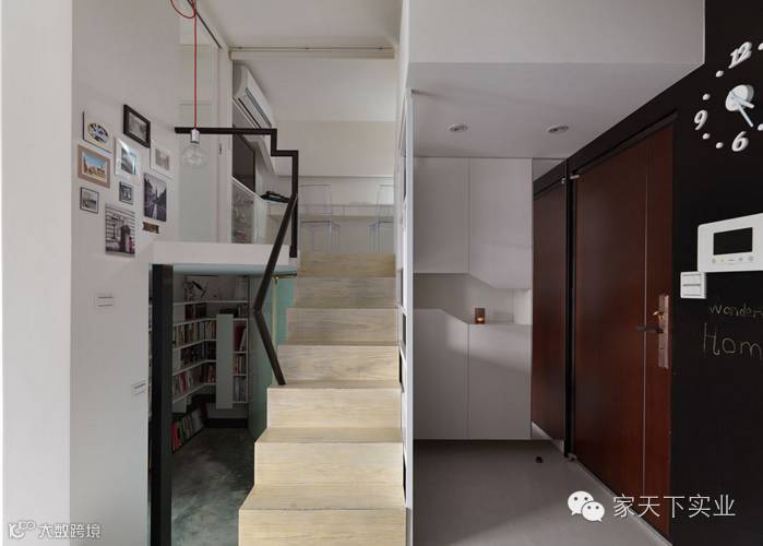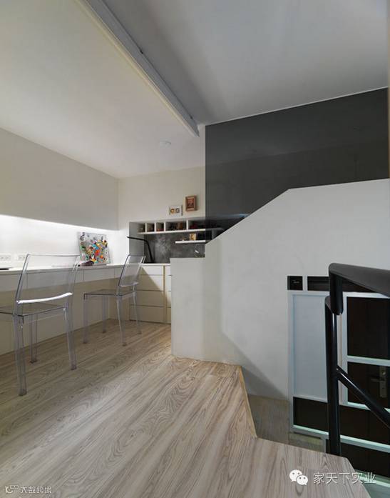 利用玄关上方做一个小阁楼与书房相连,这个单人房尺寸的休息空间,也能提供访客小憩甚至留宿。