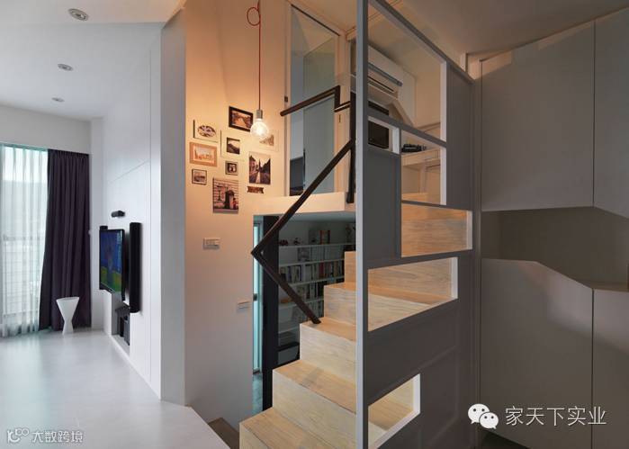 楼梯以木纹妆点,既是引领开启上下层魔法空间的推手,也低调隐藏侧边的收纳柜。