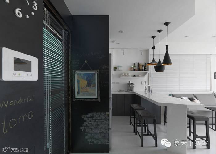 入口处的墙面以黑板漆处理,并持续延伸到厨房,既是视觉焦点也是全家的记事本、涂鸦墙,视觉效果与实用性双赢。