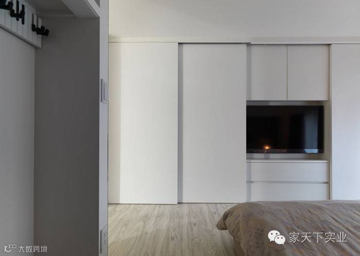 可藏于系统衣柜的电视与左侧置放外出服的挂衣区,以简单的设计线条与利落的收纳功能挂帅。
