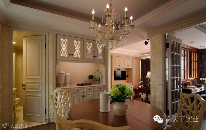 古典样貌的家私与图腾壁纸,与圆形餐桌、水晶吊灯相互辉映,营造典雅的餐叙氛围。