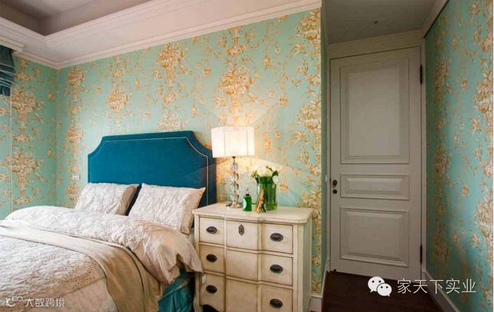 湖水蓝的花纹壁纸,搭配贵族蓝的床板,精准塑造浪漫优雅的睡眠神情。