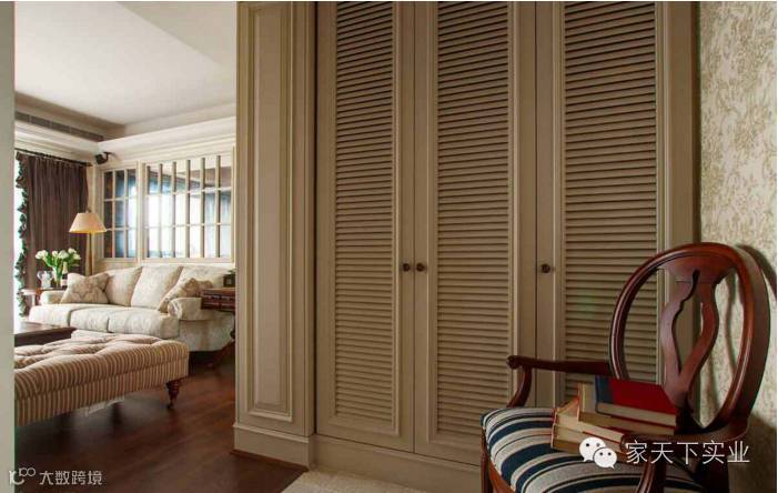 设计师使用复古砖作为划分公共空间的地面;侧面规划了一排百叶鞋柜,除了塑造古典风格也具有通风的效果。
