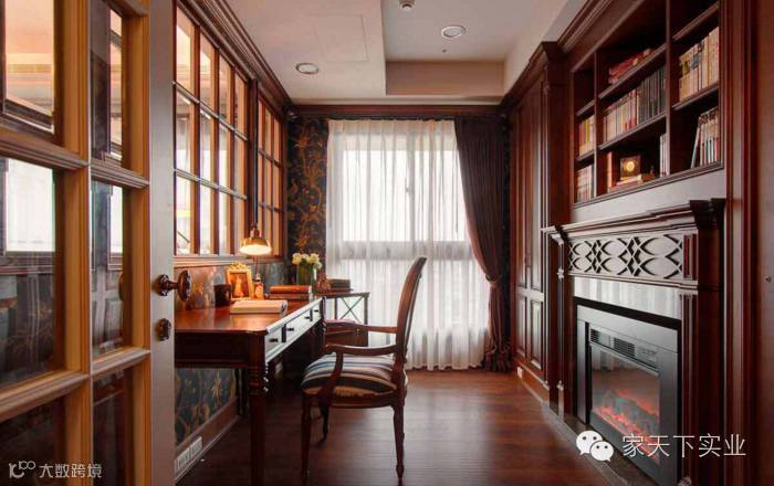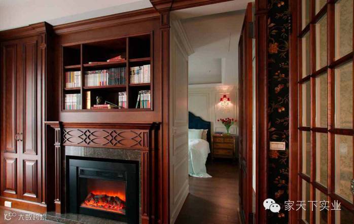 书房壁炉的两侧,为对称式的柜面造型,其右方的柜面更设计一道隐藏门,作为通往主卧的动线。