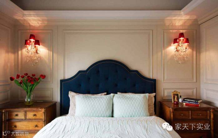 在主卧的墙面规划上,以简约线板搭配红色灯罩的壁灯,增添色彩与主题性。