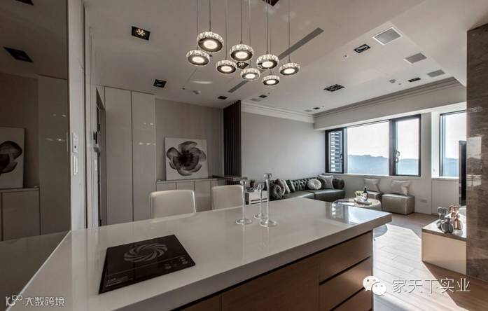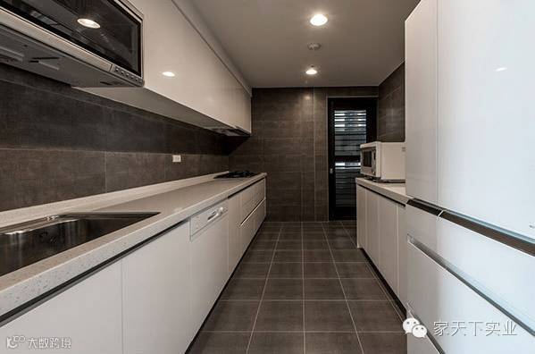 在深灰色的稳重色调中,厨具的洁白纯净,创造深浅色对比的时尚韵味。