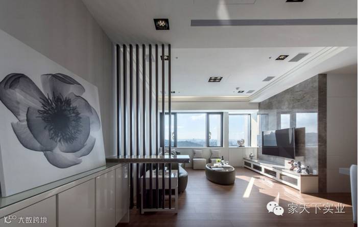右侧墙面透过不规则的镜面分割,刻划立面的线条美感,并暗中隐藏着客卫与厨房入口。