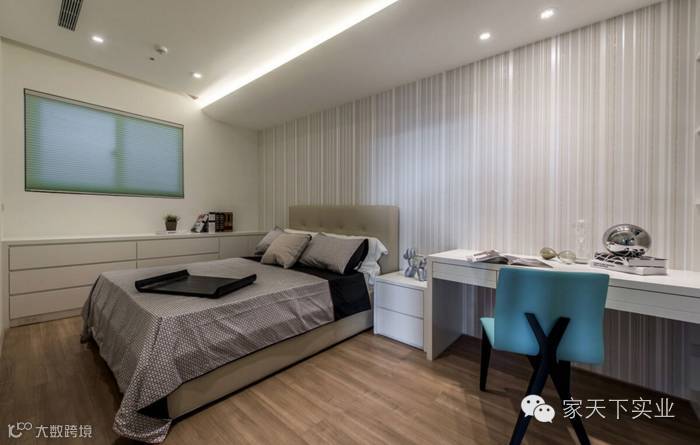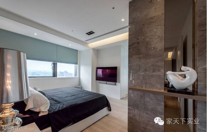 进入主卧,设计师特意搭构一道端景墙,塑造视觉转折效果,构成一进又一进的优雅动线。